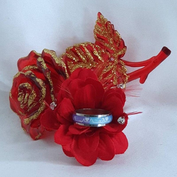 Bague en acier inoxydable de couleur argent, surmontée d'un liseré bombé de vert à violet imprimé de battements et de coeurs.